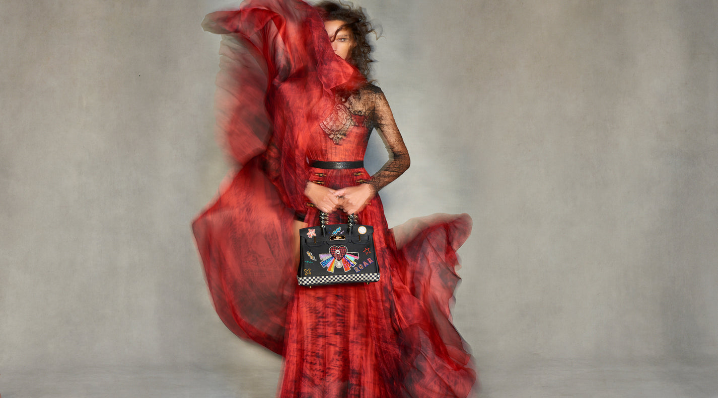 The custom collection is fuelled by the desire to challenge the boundaries of the handbag, constructing it as a treasured work of art, a future heirloom. Each bag is reborn, with attitude, layering contrasts and contradictions of references from fashion, art, history and culture.